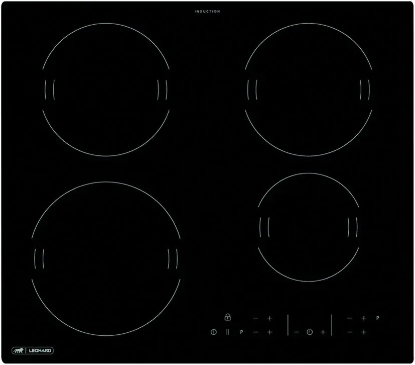 The Leonard independent cooktop with top-mounted controls is frameless and suitable for flush installation. It is an induction cooktop. The dimensions are 590mm x 520mm.