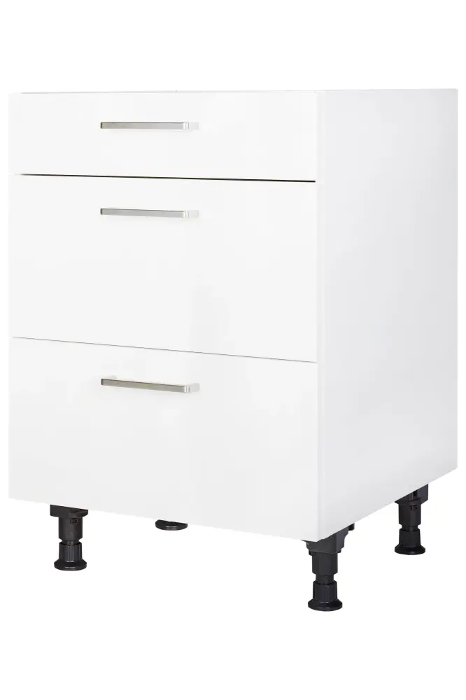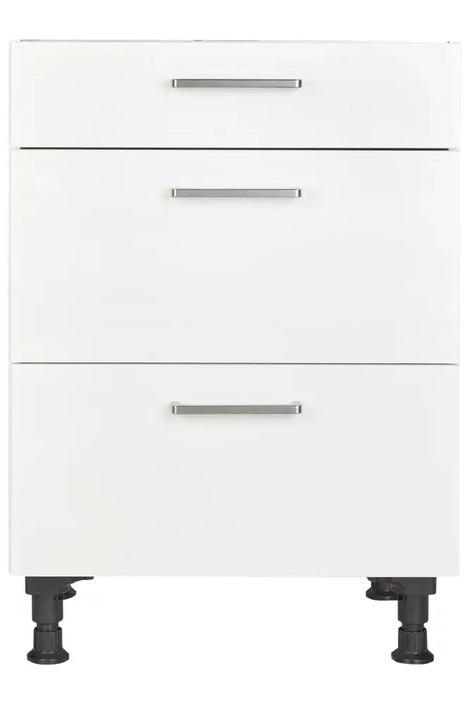 The pre-assembled cooking zone cabinet consists of a drawer, a spacer shelf for the cooktop, and two pull-outs. The cabinet has the decor Alpine white and the dimensions 720mm x 600mm x 561mm. The heat protection base (DBKI) is not pre-assembled.