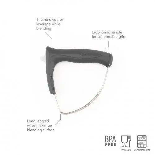 This pastry blender won’t flake on you! Incorporate butter into flour for a perfectly flaky pie crust with this easy-cleaning tool. Angled wires facilitate a rocking motion for cutting butter or shortening into flour promptly. Easy-push tab separates wires for effortless cleaning.