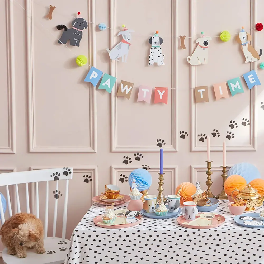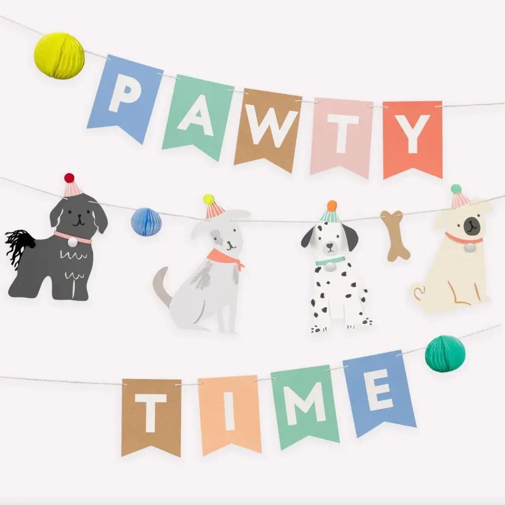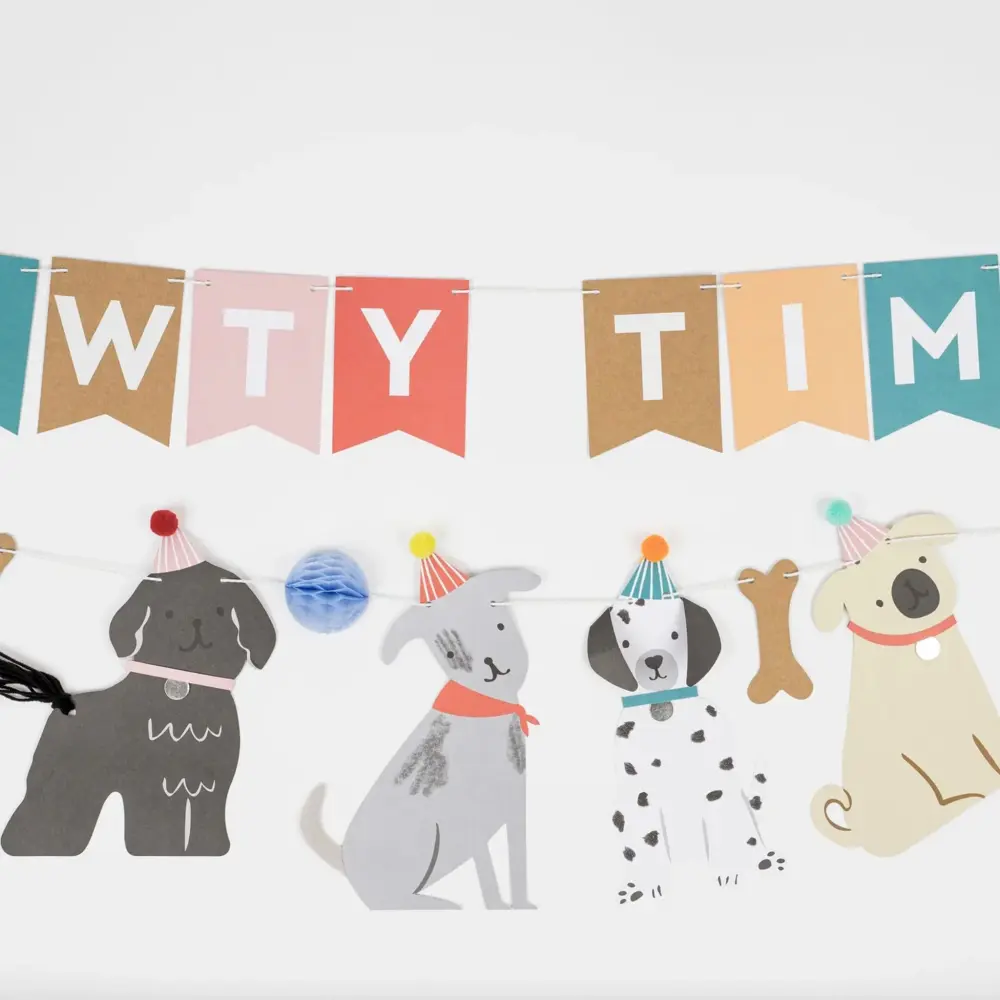 It’s pawty time! Kids (and adults) who love puppies will simply adore this garland featuring furry friends with embellished tails and pompom hats, bones and honeycomb balls. Drape it on the party table or on a wall for a delightful decoration. It’s perfect for a dog lover’s birthday party or a party for your family pet.