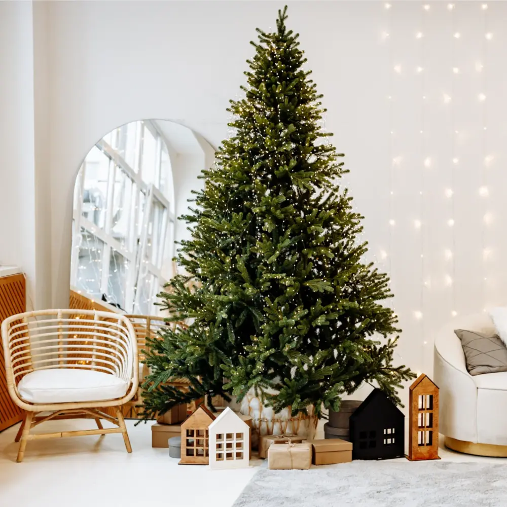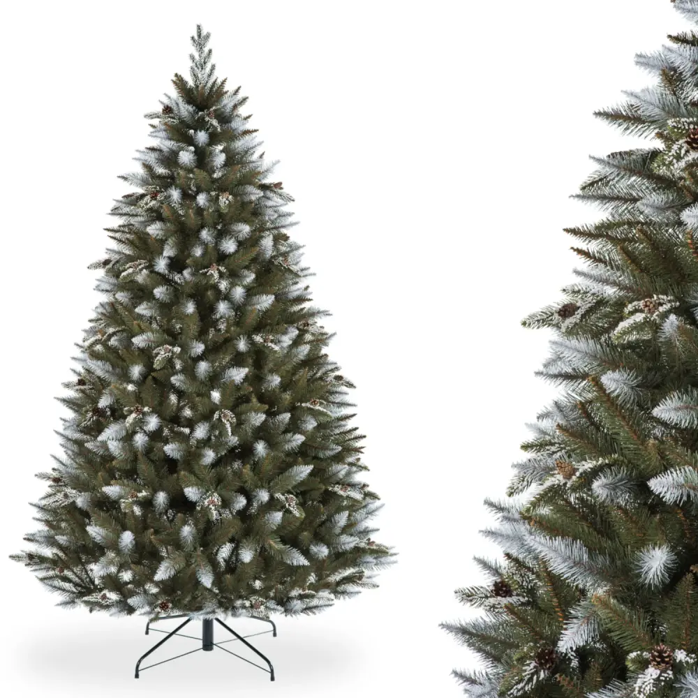 Snowy spruce with PE twigs. Fir made of high quality rot-green PVC film. Which beautifully reflects the natural color of the tree. In addition, it was decorated with PE twigs. Rot emerald is one of the most interesting shades of this color. It is warm enough due to the addition of yellow pigment, but certainly darker and more saturated than olive. Unlike khaki, it lacks the addition of brown. It is a shade clearly inspired by nature. It can be associated with swamp vegetation or a damp, slightly ebony jungle. The branches of the Christmas tree consist of thin, rather stiff needles about 2 cm long, with a fake trunk of brown foil in the middle. The needles are very close together, making the Christmas tree dense. Some of the twigs at the ends are covered with snow with a premium white paint. The Christmas tree was enriched with PE twigs, on which artificial snow and a natural pine cone were applied by hand. All PVC twigs, cut in the shape of a natural cone, are permanently attached to a do