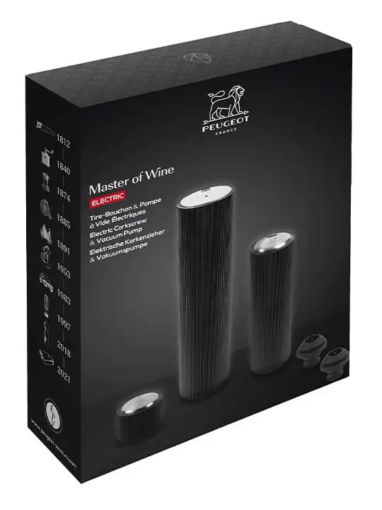 Peugeot’s signature contemporary wine set blends Line Reverse and Line Preserve . A slick, graphic design that balances elegance and technology. Equipped with a latest-generation Lithium-ion battery, the 100% automatic Line Reverse corkscrew makes uncorking a pleasure, and for those who don’t finish the bottle, the Line Preserve electric pump prolongs the quality of the wine for several days.