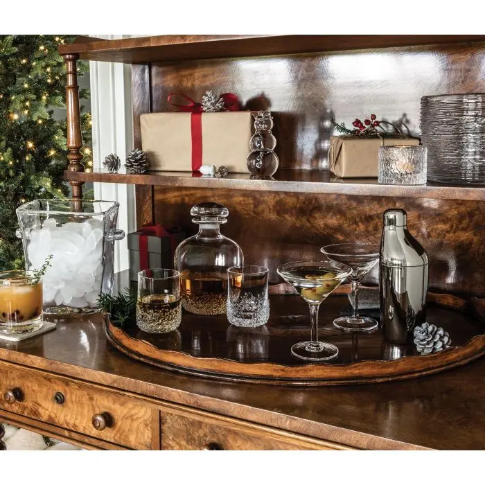 A Simon Pearce signature, the contemporary angles of Woodbury toss in balanced geometry to any setting. Here, this squared-off glass ice bucket features brilliant flat panes that showcase the clarity of the material. Use it to chill whites, rosés or sparklers, to serve ice on the bar, as an oversized vase, or filled with your favorite keepsakes. Perfect for personalized engraving.