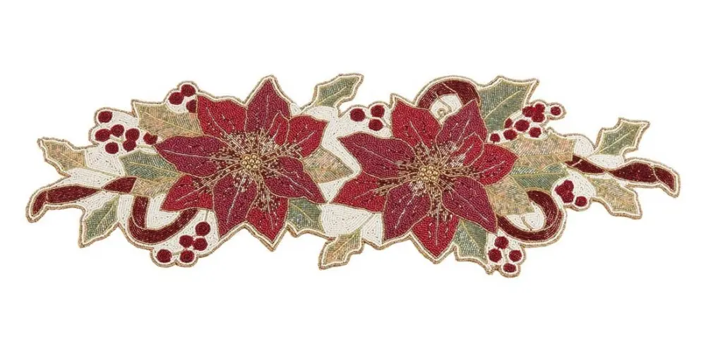 Excellent for always-on décor, this charming Poinsettia Design Beaded Table Runner brings a polished note to any space. It’s ideal for the winter season, adding a beautiful splash of color to your home. The glass beads catch and reflect light, lending a glittery touch to the tabletop, while the red and green color palette makes it easy to pair and fit. 65% Glass Beads – 35% Polyester Wipe With Dry Cloth