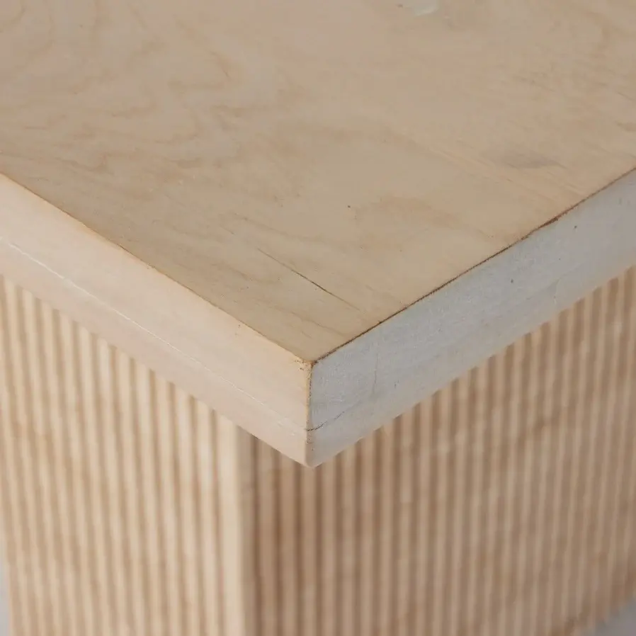 Unpatterned marble and white oak fuse for a monochromatic look inspired by 1970s architecture. Linear rib detailing bring texture to a simple pedestal base. Seats eight comfortably.