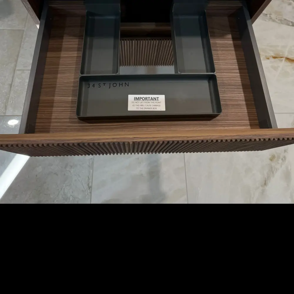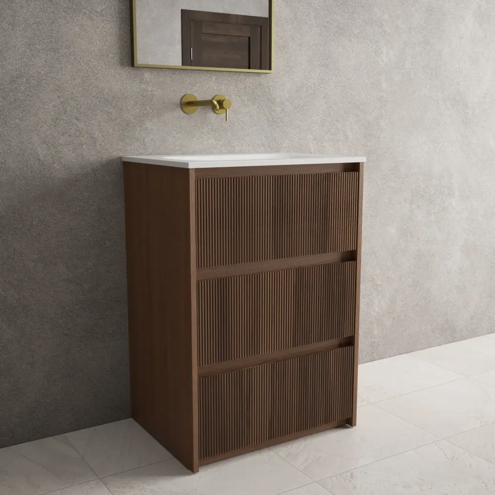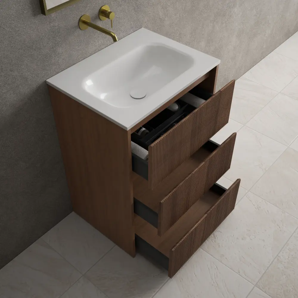 The Scanalato 600mm 3 Drawer Floor Standing Vanity Unit is a fashion-forward, compact bathroom unit featuring a fluted front, integrated matt white basin, and three soft-close drawers for practical storage. Made from solid wood and finished in walnut, it’s available in 5 colours – or a custom shade – to suit your space.