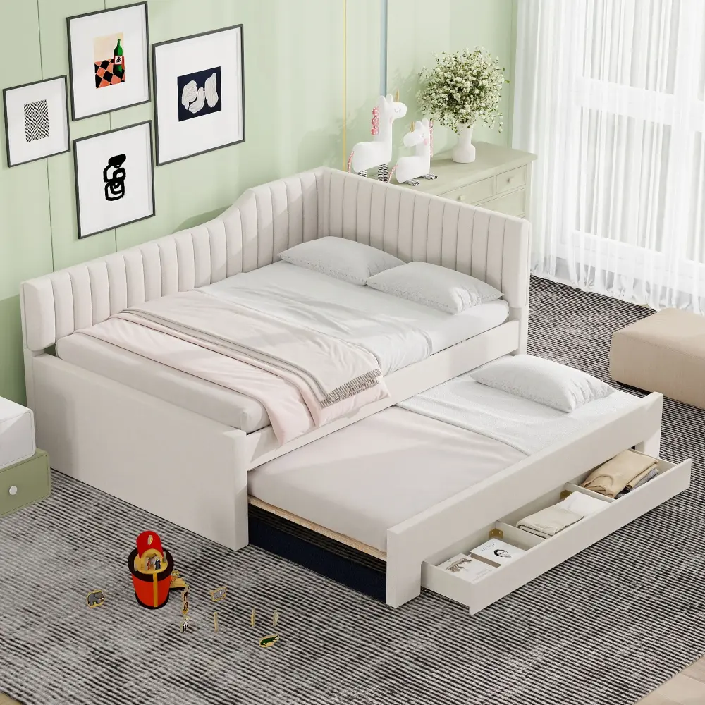 Full Size Upholstered Daybed With Trundle And 3 Drawers – Beige
