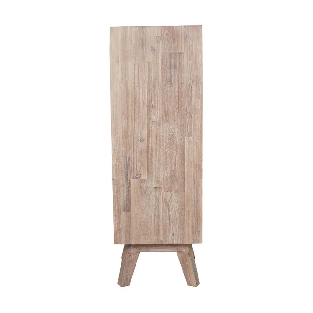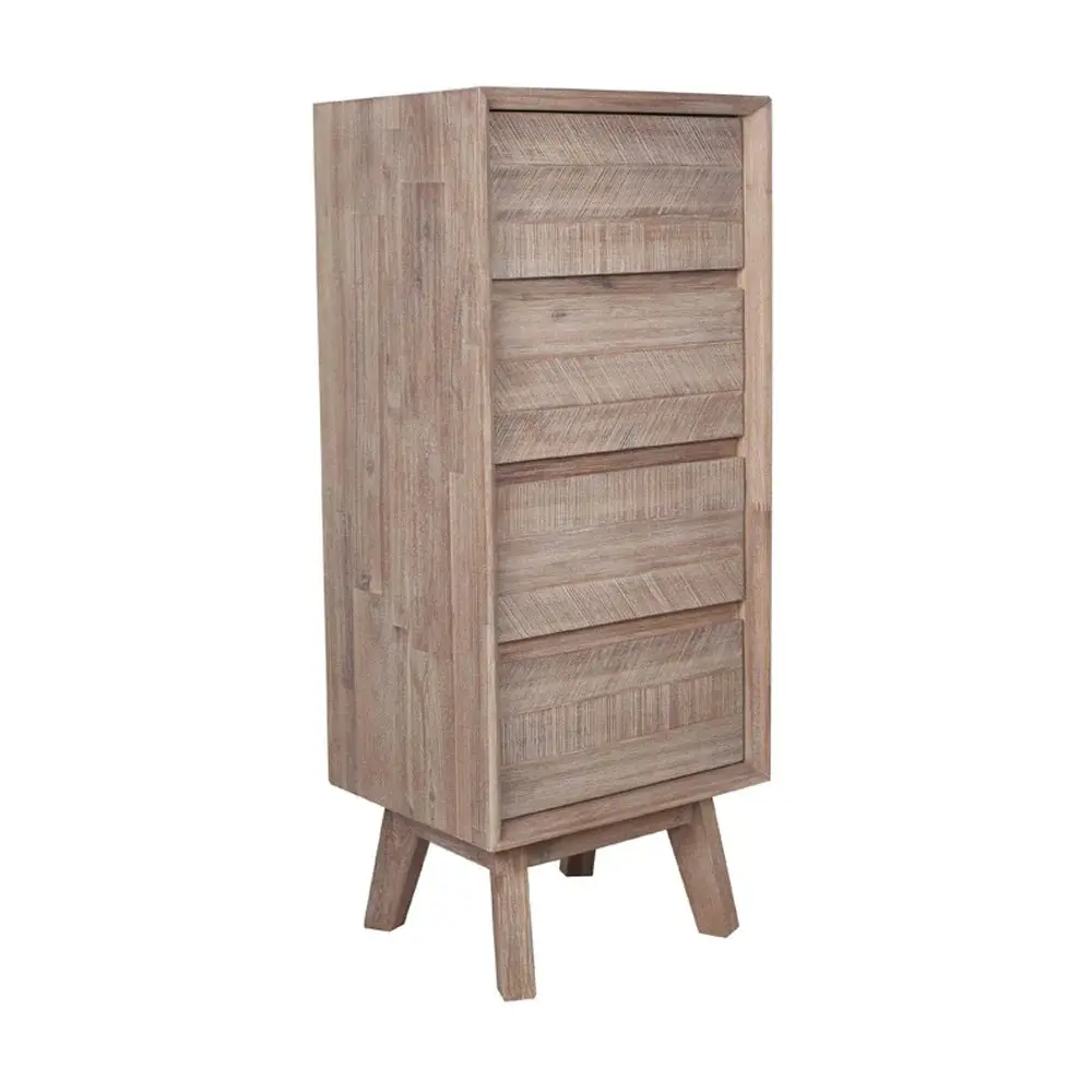 Look no further for a Scandi style with an artisan twist! This four-drawer tallboy, sand-washed acacia wood unit from the Melville Collection would rejuvenate any interior with its clean-lined and modern finish. Complement this look with the rest of the range of seven pieces, which include the one drawer bedside unit, three drawer bedside unit, three drawer unit, three drawer and three-door side sideboard unit, a console unit and two drawer desk.