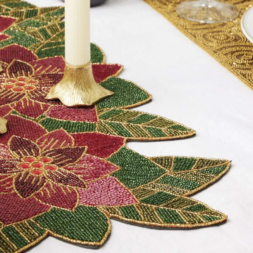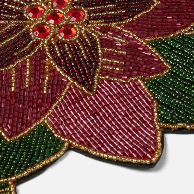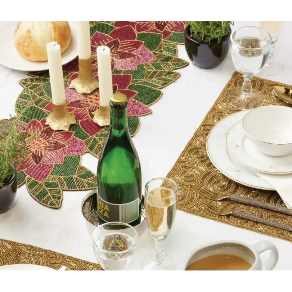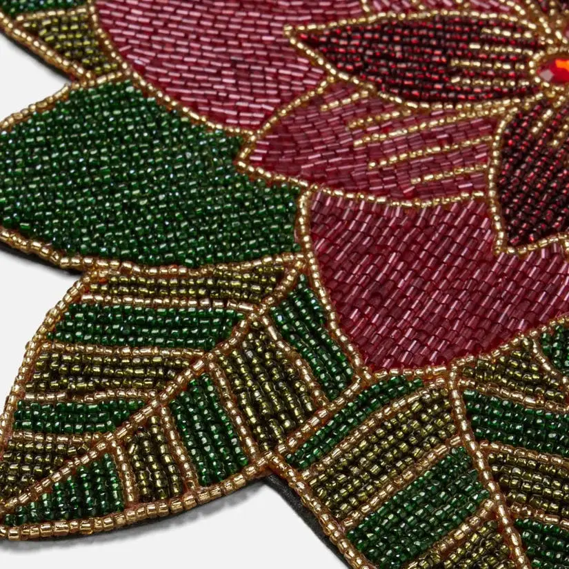 This festive bouquet of hand-beaded poinsettias is an enchanting centerpiece for any holiday meal. Intricately constructed from a mix of glass beads in shiny greens, golds, and reds. Material: Glass Beads.
