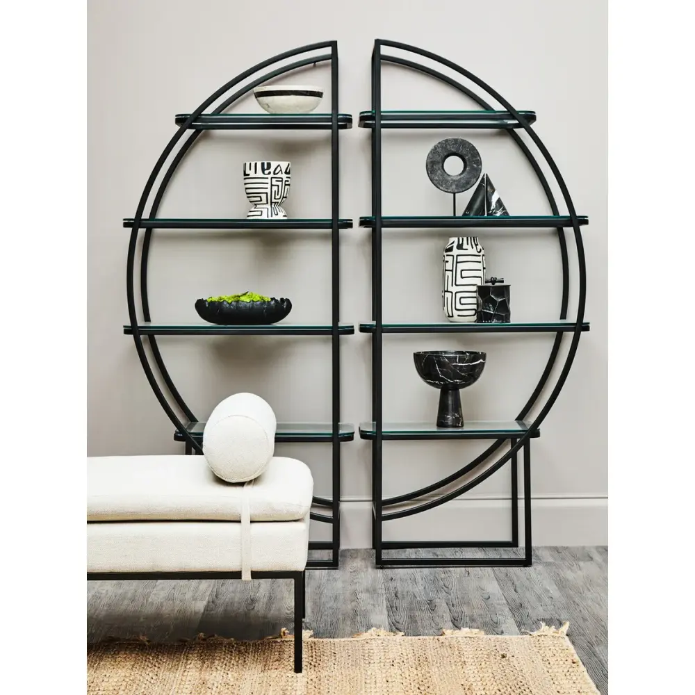 The Vogue right half moon unit has a hard-wearing art deco influence, with bold geometrical features balanced by a harmony between materials. The frame is crafted from strong dull-finish black stainless steel, which is complemented by the four clear glass shelves.