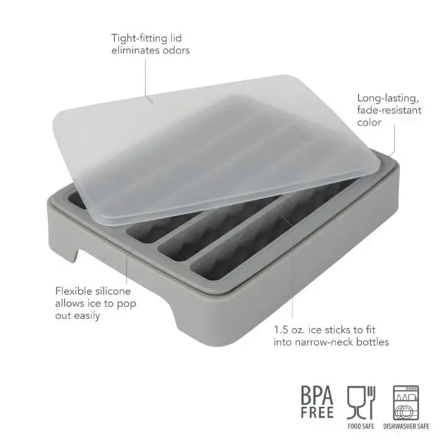 - Perfect Ice for Water Bottles: This oyster gray-colored tray builds five 1.5 oz cylindrical ice sticks that fit most narrow-neck reusable and store-bought bottles.