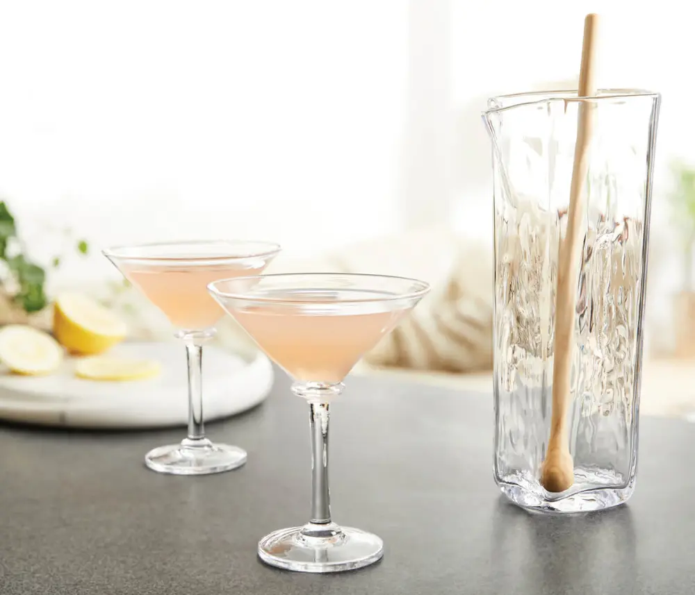 A contemporary take on a vintage cocktail shape. With unique squared-off creases in its round bowl, we designed the Woodbury Martini with half-clear, half-chill-textured surfaces to match our customer-favorite Woodbury Tumbler.