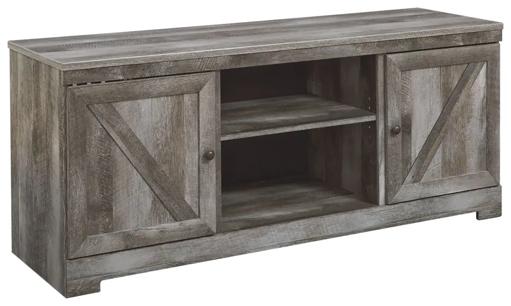 This TV stand is sure to win your heart with its daring take on modern rustic design. Its crisp, clean minimalist-chic profile is enriched with a striking replicated oak grain, thick plank styling and a rustic charcoal finish for that much more authentic character. Crossbuck detailing adds a brilliant barn door inspired touch. Opt for the optional fireplace insert (sold separately) for added warmth.